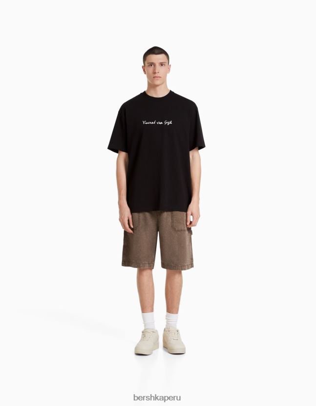 negro Bershka hombres camiseta de manga corta con estampado de van gogh 806J6B2626